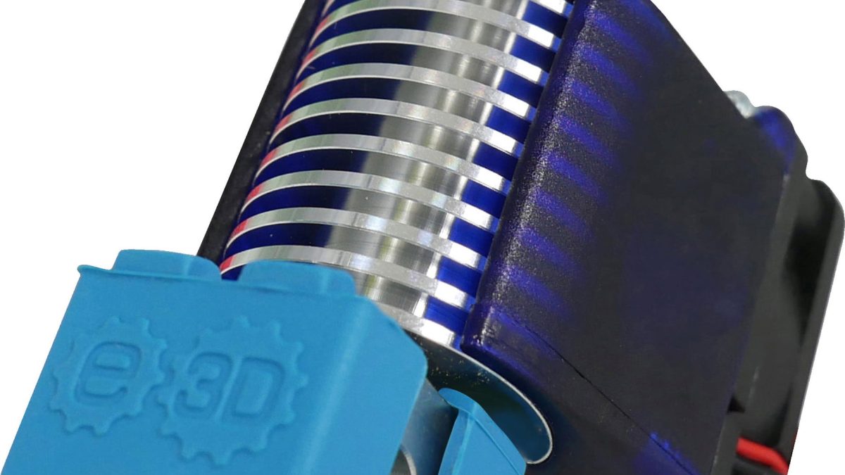- Radiator (Czerwony) – zwany również chłodnicą – odpowiada za zapewnienie odpowiedniej temperatury filamentowi, zanim trafi do części gorącej i rozproszenie ciepła przeniesionego przez łącznik. Pozwala to na uniknięcie zbyt wczesnego roztopienia filamentu i powstawania zatorów. Radiator chłodzony jest za pomocą wentylatora.